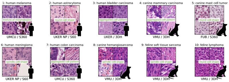 The challenge covered multiple types of covariate shifts: different scanners (causing color, sharpness, and depth of field changes), different tumor types, and various species (human, canine, feline).